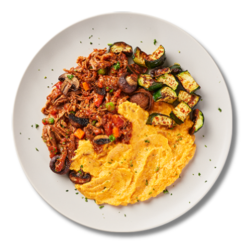 AAA Grade Grass-Fed Beef Chucks, Zucchini, Sweet Potato, Garlic Oil, Tomato Paste, Onion Paste, Garlic Paste, Celery Dice, Carrots Dice, Oregano, Parsley, Thyme, Kosher Salt, Black Pepper, Red Wine Vinegar, Crushed Tomatoes, Soy Sauce, Veg Stock, Bay Leafs, Mushrooms.